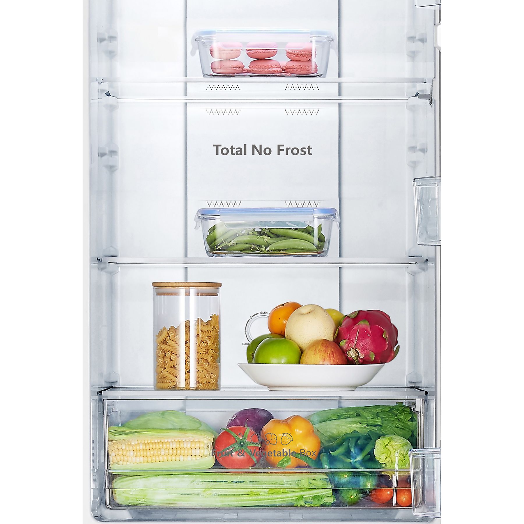 De ETNA KCV282NWIT is een praktische koel-vriescombinatie in wit met een totale netto-inhoud van 256 liter. Dankzij No Frost Plus-technologie hoef je de vriezer niet meer handmatig te ontdooien en blijf je verzekerd van een constante, gelijkmatige koeling met MultiFlow 360°. Het apparaat heeft LED-verlichting voor helder zicht in de koelruimte, genoeg opslagruimte met verstelbare plateaus en een stil geluidsniveau — ideaal voor dagelijks gebruik in elke keuken of bijkeuken.
